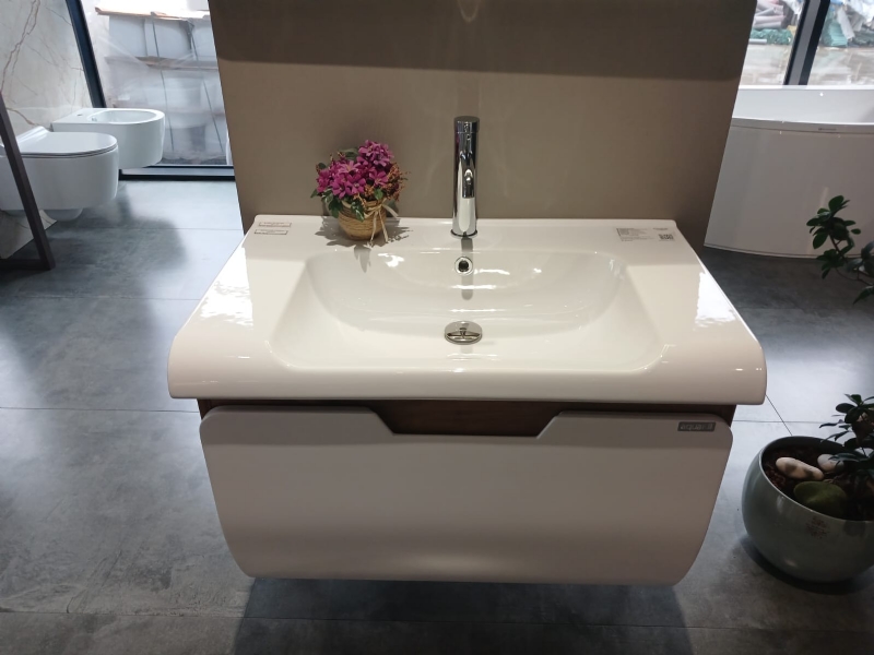 Mobilje tualeti Tales me dizajn elegant, Mobilje tualeti MDF i plastifikuar kundra ujit, Mobilje tualeti me lavaman porcelain, Mobilje tualeti me mishelator Italian, Mobilje tualeti me pasqyre LED, Mobilje tualeti me kornize te zeze